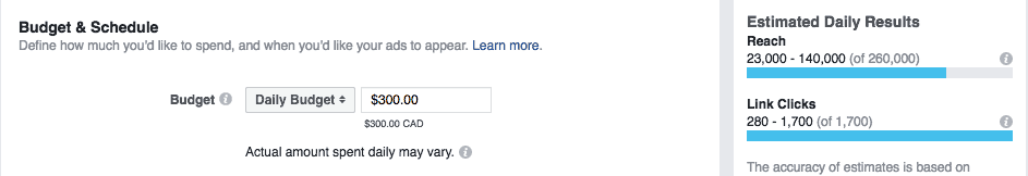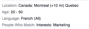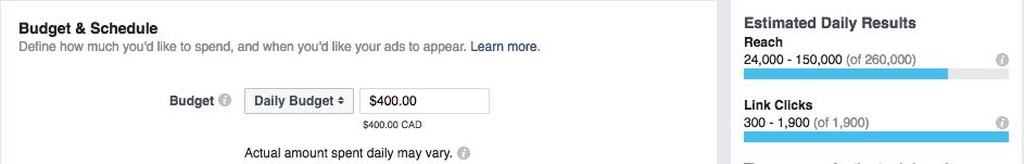 Le nombre de créatifs dans la campagne aura aussi un impact sur le budget. Si la campagne ne contient qu’un seul créatif, on préfère habituellement garder la fréquence basse. En revanche une campagne qui possède 3 créatifs peut se permettre une haute fréquence. On veut éviter la fatigue visuelle afin de ne pas causer de la frustration chez notre cible. Si la publicité est pertinente, la cible n’aura pas besoin de la voir 20 fois par jour. De plus, Facebook affiche la grosseur totale de l’audience, mais cela ne veut pas dire que votre défi est d’atteindre chaque individu.