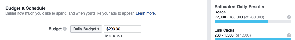 En modifiant le budget quotidien (par essai-erreur) on remarque que, pour atteindre le nombre d’impressions souhaité, il nous faut un budget approximatif de 200$ par jour.
