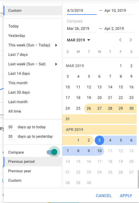 Pour comparer, nous allons utiliser l’outil de sélection de dates et activer l’option « compare » et comparer à la période précédente. Cela nous permettra de voir les hausses et les baisses par la suite. Voici comment le configurer :