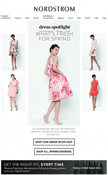 Ensuite, l’excellente infolettre de Nordstorm qui ne sort aucun nouveau produit mais met en avant ses articles les plus printanier. Le courriel continue en parlant des accessoires de la saison. « What’s fresh for spring »