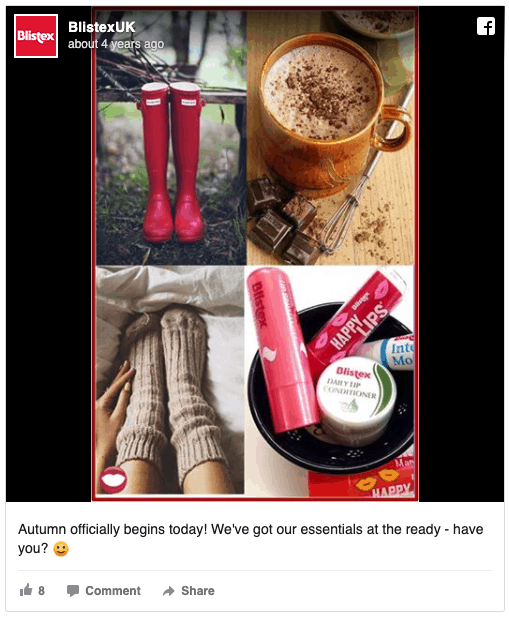 La saison préférée de nombreux québécois arrive à grande vitesse avec ses odeurs et couleurs chaleureuses. Vous pouvez faire de l’humour comme Turtle Wax en associant vos produits aux stéréotypes de l’automne. Red Mango (comme Starbucks, Second Cup, etc.) célèbre l’arrivée de la nouvelle saison en ajoutant un produit unique à sa sélection originale (#pumpkinspice). Vous pouvez aussi prendre exemple sur Blistex qui rappelle les produits essentiels de l’automne en mettant en avant certains de leurs produits. Ici, Blistex le fait au travers d’une image publié sur les réseaux mais partager une lise d’essentiels par courriel est aussi une excellente option.