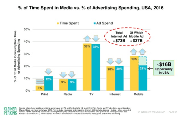 Comme le montre l’image suivante, on peut comprendre que les marketers l’ont compris avec la hausse de l’investissement en média sur mobile qui est en cours.