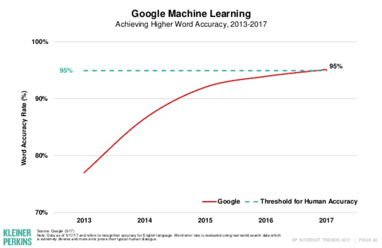 Comme le montre l’image suivante, Google prétend que son outil de reconnaissance vocale a un taux de succès de compréhension à 95%. Plus ce taux augmentera, plus on pourra voir de recherches faites par voix (et plus les utilisateurs seront contents).