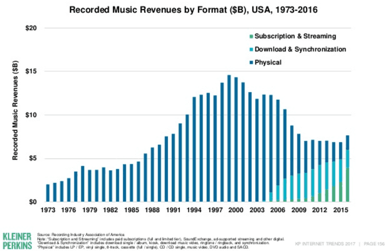 Beaucoup moins dans notre domaine du marketing numérique, mais c’est très intéressant de constater le changement qui est en train de s’effectuer dans l’écoute de musique en ligne avec le streaming qui prends le plus de place actuellement comparativement à l’achats de musique en ligne ou physique.