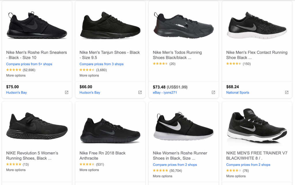 L’onglet Shopping n’est pas un outil qui offre la meilleure expérience utilisateur qui soit en raison de ses résultats de recherches. L’inventaire disponible n’est pas des plus pertinents car il contient seulement les annonceurs qui ont une enchère active sur Shopping Ads. Prenons en exemple un utilisateur qui voudrait acheter des souliers Nike Todos RN et qui veut comparer les offres sur Google Shopping.