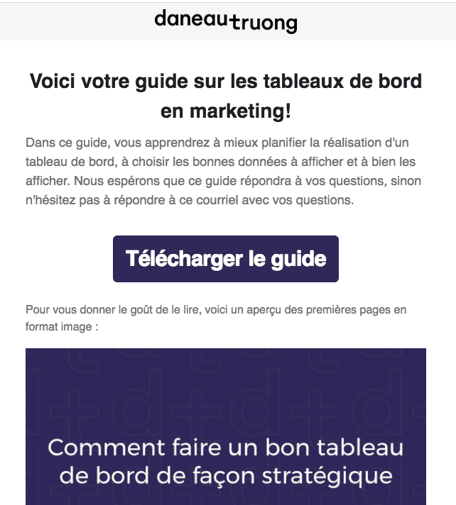 Un classique dans le inbound marketing, échanger le courriel contre un guide ou un modèle. Cela est aussi du marketing d’automatisation! Vous pouvez voir un exemple sur notre guide sur les tableaux de bord! C’est un outil très utile pour ajouter des utilisateurs dans votre CRM à l’aide de contenu utile.