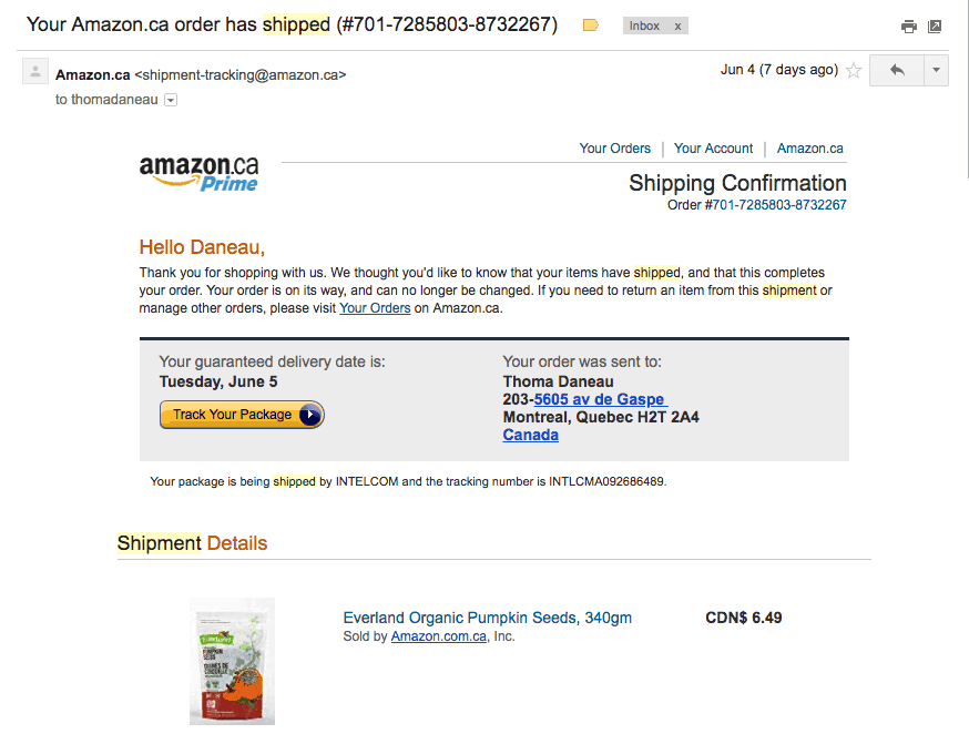 Voici un exemple d’Amazon, ce courriel est envoyé à chaque nouvelle commande lorsque la commande part de leur entrepôt:
