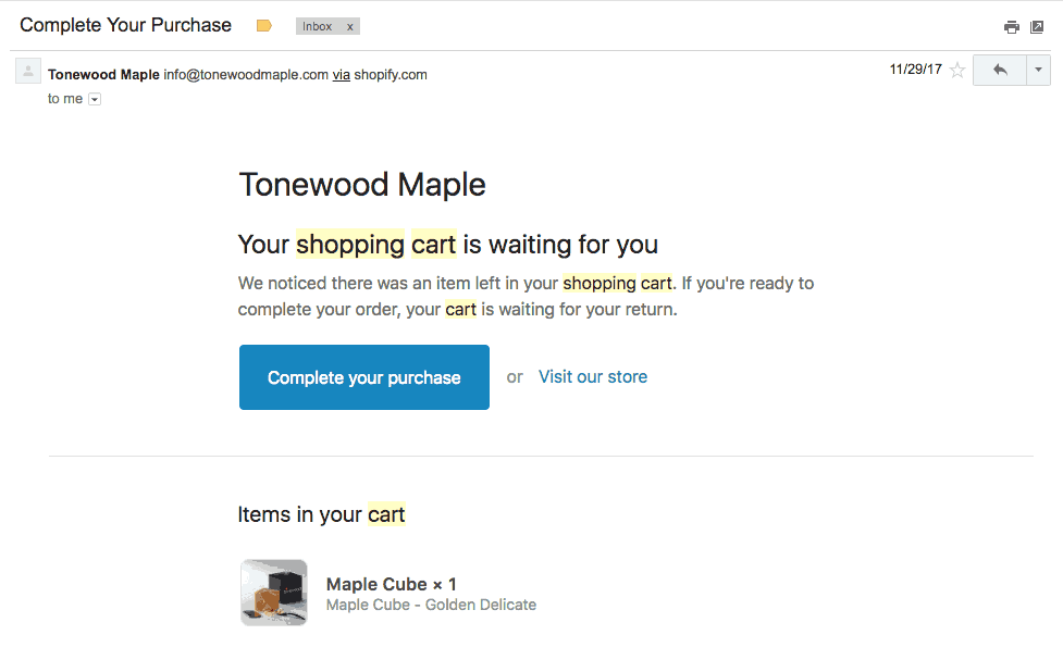 Bref, ce courriel est probablement le courriel le plus important à envoyer (qui n’est pas une infolettre) qui peut avoir un impact important sur votre entreprise. En affichant à nouveau les produits à l’utilisateur qui vient de les ajouter à son panier d’achats, vous lui donner une seconde chance d’acheter. De plus, en ajoutant un rabais de 10%, c’est parfois la goûte qui fait déborder le vase de l’achat.