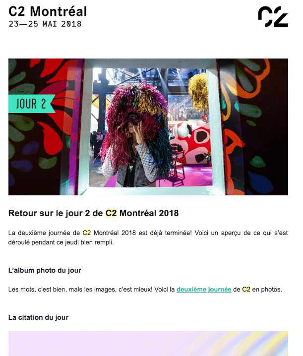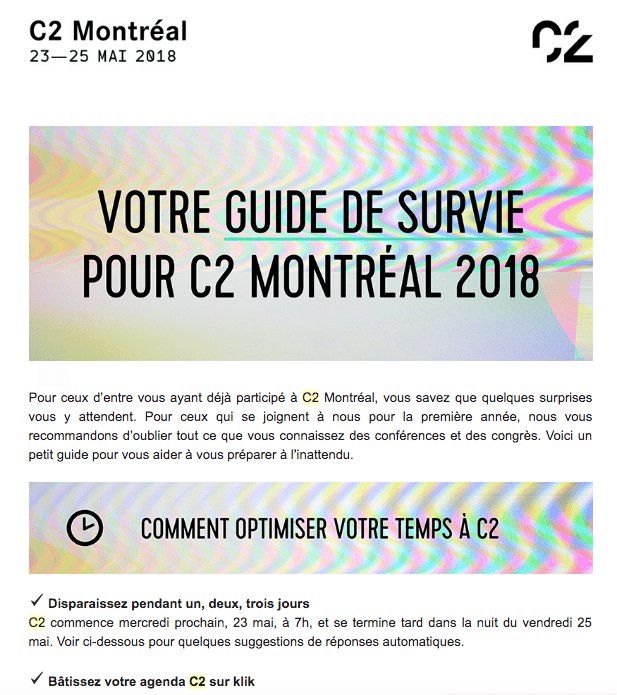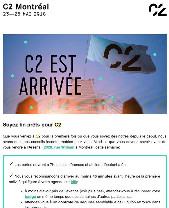 C2 Montréal est un très bon exemple de ce genre de pratique. Voici quelques courriels reçus par les participants avant l’événement (et pendant):