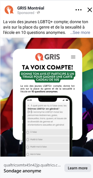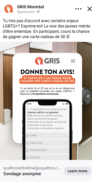 GRIS-Montréal souhaitait mieux comprendre les perceptions des jeunes de 14 à 22 ans sur les orientations sexuelles et les identités de genre. Pour y parvenir, nous avons conçu une campagne numérique diffusée sur Meta (Instagram et Facebook) et TikTok Ads, les plateformes où cette génération passe le plus de temps. L’objectif : rejoindre des jeunes afin de recueillir leurs réponses à un questionnaire de recherche anonyme et sécuritaire. Voici comment nous avons relevé le défi de rejoindre les jeunes là où ils sont, sans jamais influencer leur voix — notre petite étude de cas marketing.