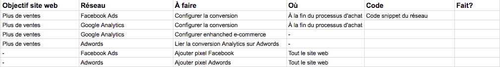 Pour être vraiment certain de tout faire correctement, je conseille une grille de suivi pour les différentes actions à faire sur le site web. Voici un exemple :