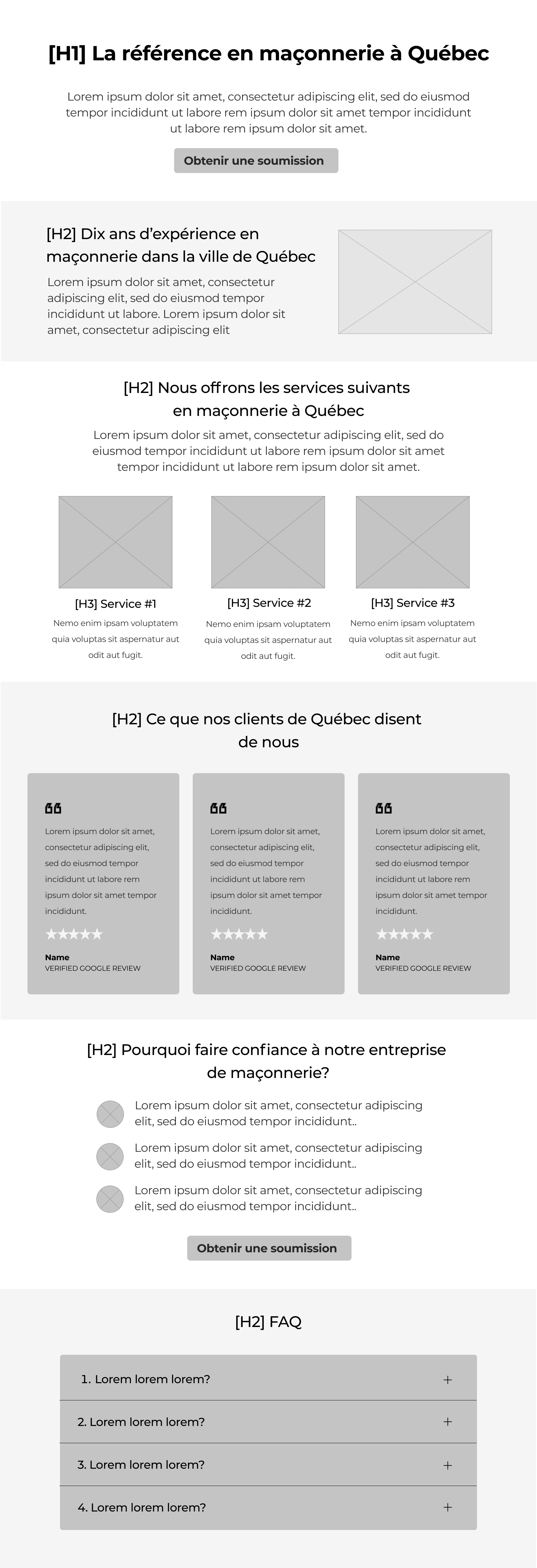 Si un prospect cherche Maçonnerie Québec sur Google, la page d’accueil de Maçonnerie St-Étienne aura de la difficulté à se positionner sur ce mot-clé, car elle n’est pas optimisée pour se présenter comme une entreprise de maçonnerie de Québec.